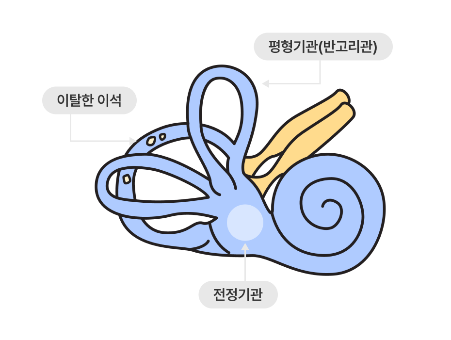 머리를 움직일 때 평형기관(반고리관) 내 이석이 움직이면서 어지러움이 발생합니다.
