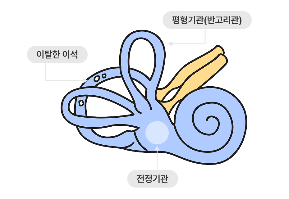 귀 안의 전정기관에 있는 이석이 떨어져 나옵니다.
