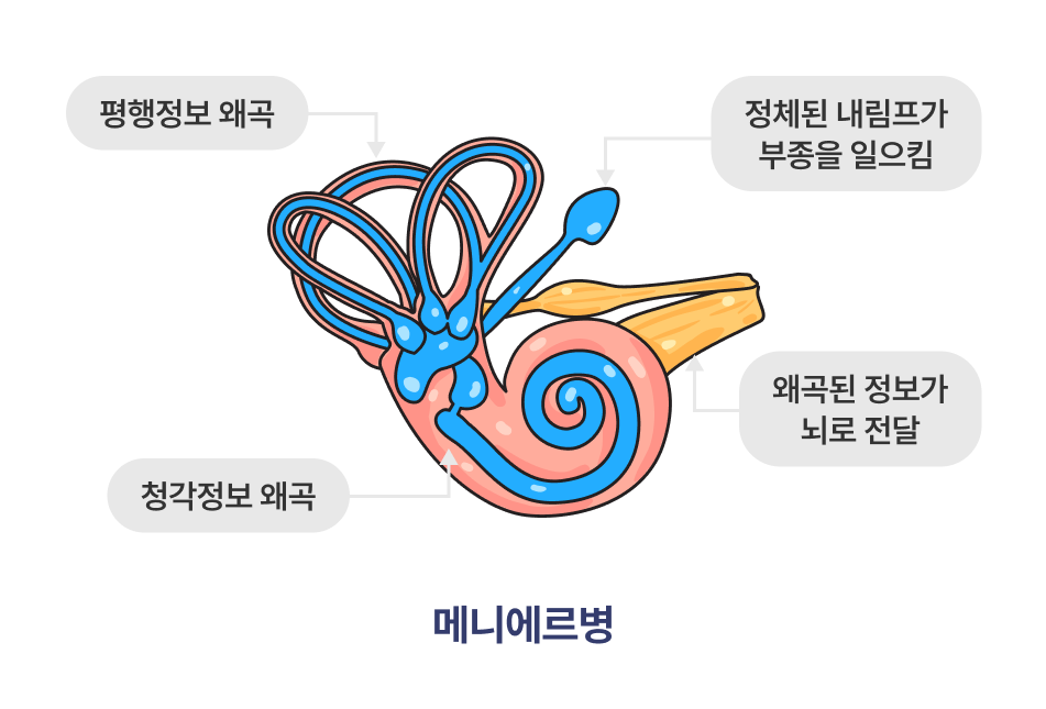 메니에르병은 내이에 있는 내림프액이 과도하게 축적되어 압력이 높아지면서 발생합니다. 이로 인해 평형과 청각을 담당하는 구조에 이상이 생겨 어지럼증, 이명, 청력 저하 등의 증상이 나타납니다.
